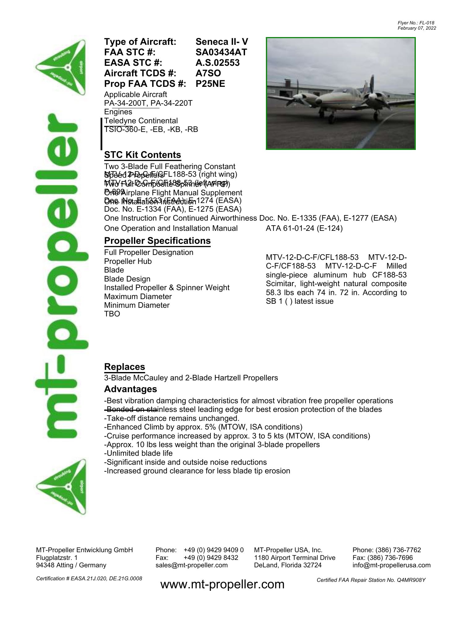 Type of Aircraft:Seneca II- V FAA STC #:SA03434ATEASA STC #:A.S.02553 Aircraft TCDS #:A7SO